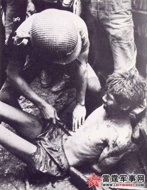 一位美国人的叙述----越战片段:他们请示过贡席上尉之后,挑出了一名尖叫着的、身材矮小的老挝姑娘,把她剥光衣服后,倒悬在一条垂在两棵大树之间直径有十厘米的藤条上,然后用匕首割断了她的喉管,鲜血从那名老挝姑娘被切开的喉管喷了出来,她激烈地扭动着身子,反缚着的手臂上下挥动着。渐渐地,她的动作缓慢下来,身子不时地抽动一下。